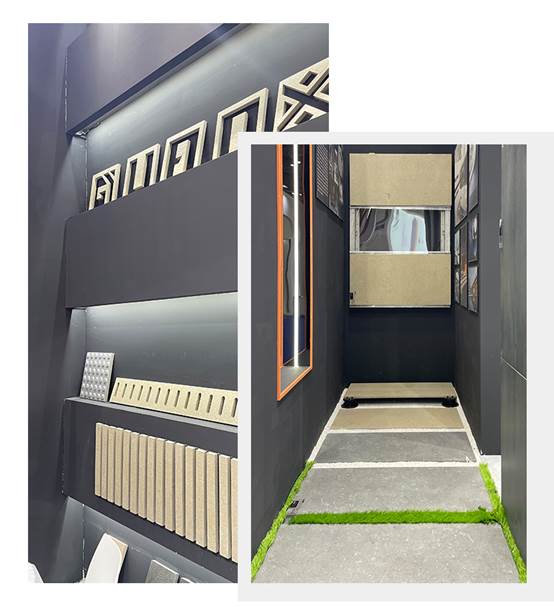 展廳地面不僅呈現(xiàn)了生態(tài)石英磚的鋪貼方式,還讓產(chǎn)品肌理與植物、與鵝卵石還原了真實的花園庭院環(huán)境,讓大家能身臨其境,打破固有束縛,塑造富有自然氣息的生態(tài)感,實現(xiàn)了人與空間的多維互動。展館空間的整體美感離不開每一處構(gòu)造與產(chǎn)品的完美結(jié)合,靈動唯美的最全花色樣磚如畫作般展示于墻上,從正面到側(cè)面到背面,讓現(xiàn)場參觀者全方位了解“30mm厚磚新時代”。