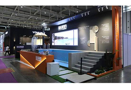 展位現場搭建“模擬泳池”,別出心裁!以生態石英磚萊姆石系列產品精心鋪貼,展現其身為戶外用磚首選的優越性能、時尚外觀,展現其靈活運用于酒店空間建設中的畫龍點睛之效!